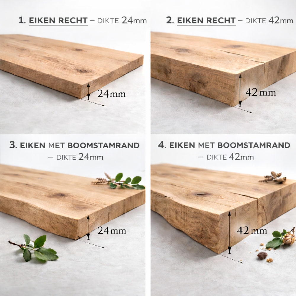 Bij Stylingathome maken we massief eiken op maat vanuit onze eigen werkplaats in Rucphen. Kies de gewenste lengte, breedte, dikte en afwerking die perfect past bij jouw interieur. Bezoek snel onze maatwerkpagina en ontdek hoe wij jouw woonwensen kunnen realiseren.